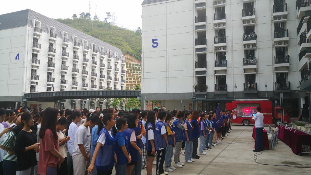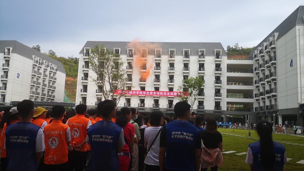 为提高广大师生宿舍消防安全应急反应和火场逃生能力,增强师生安全意识,5月26日下午,学校在北校区3号学生宿舍楼开展2021年学生宿舍消防安全疏散演练。梧州市消防救援支队、梧州市万秀区消防救援大队、学校学生工作部(处)、保卫处领导现场指导演练工作。本次演练由电子与信息工程学院主办,学院党总支书记郭慧担任演练总指挥。